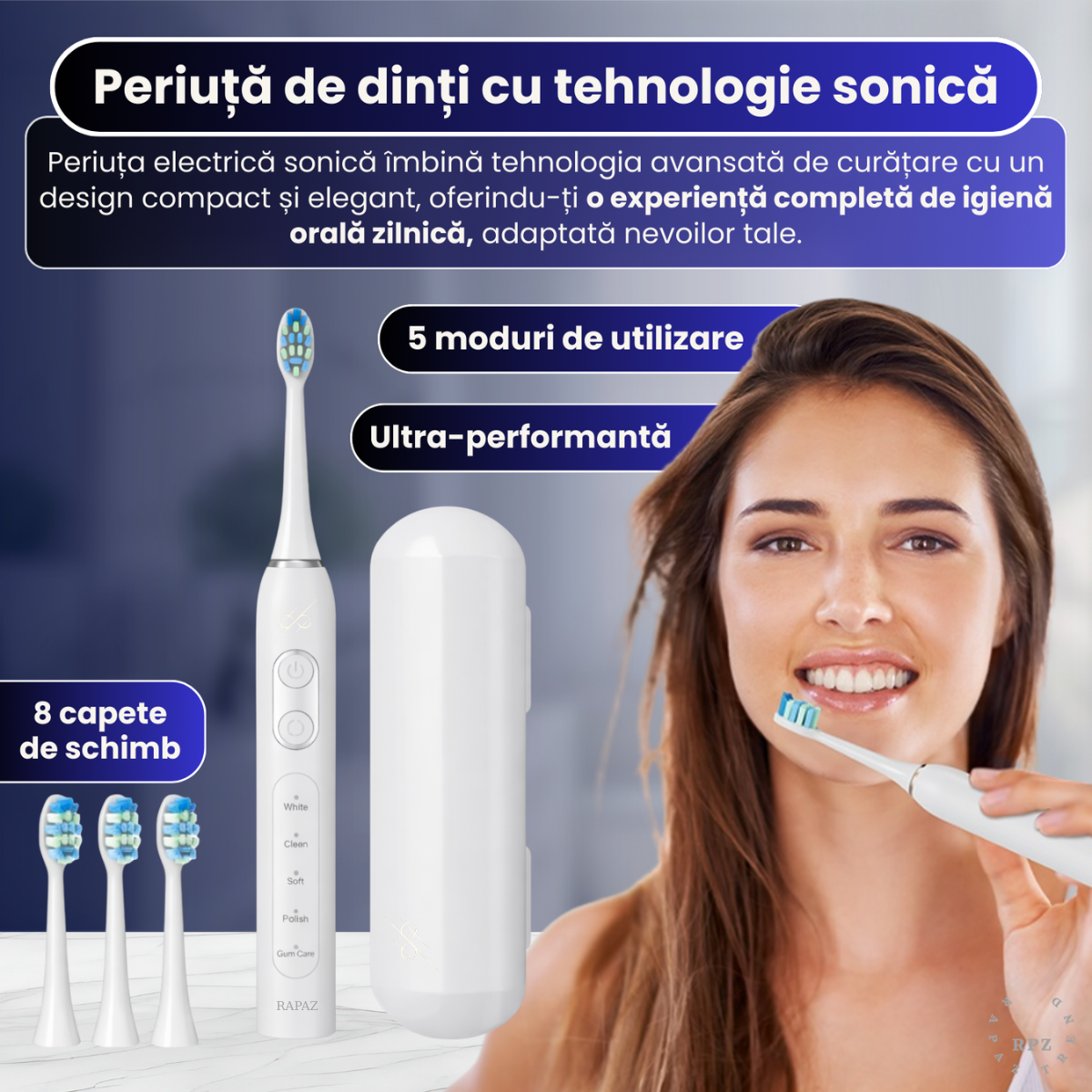 - Moduri: White, Clean, Soft, Polish, Gum Care